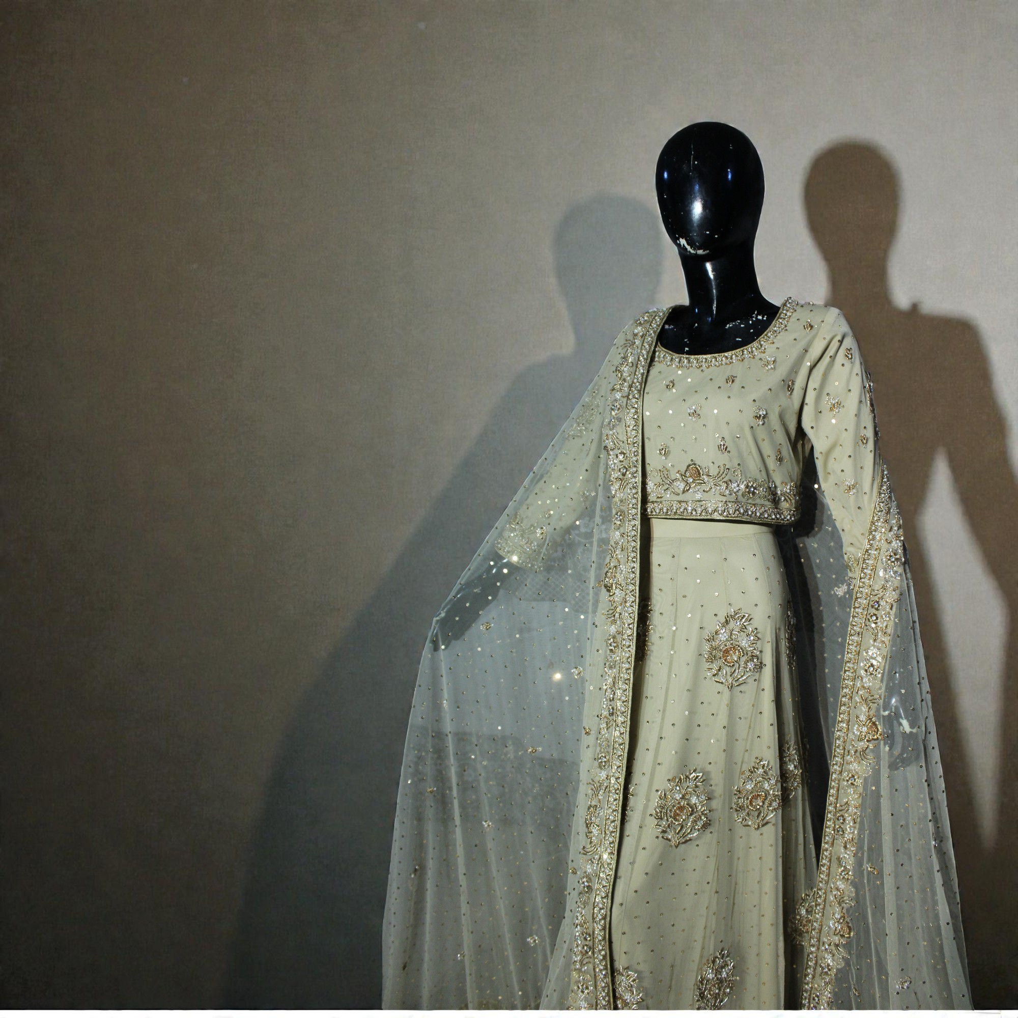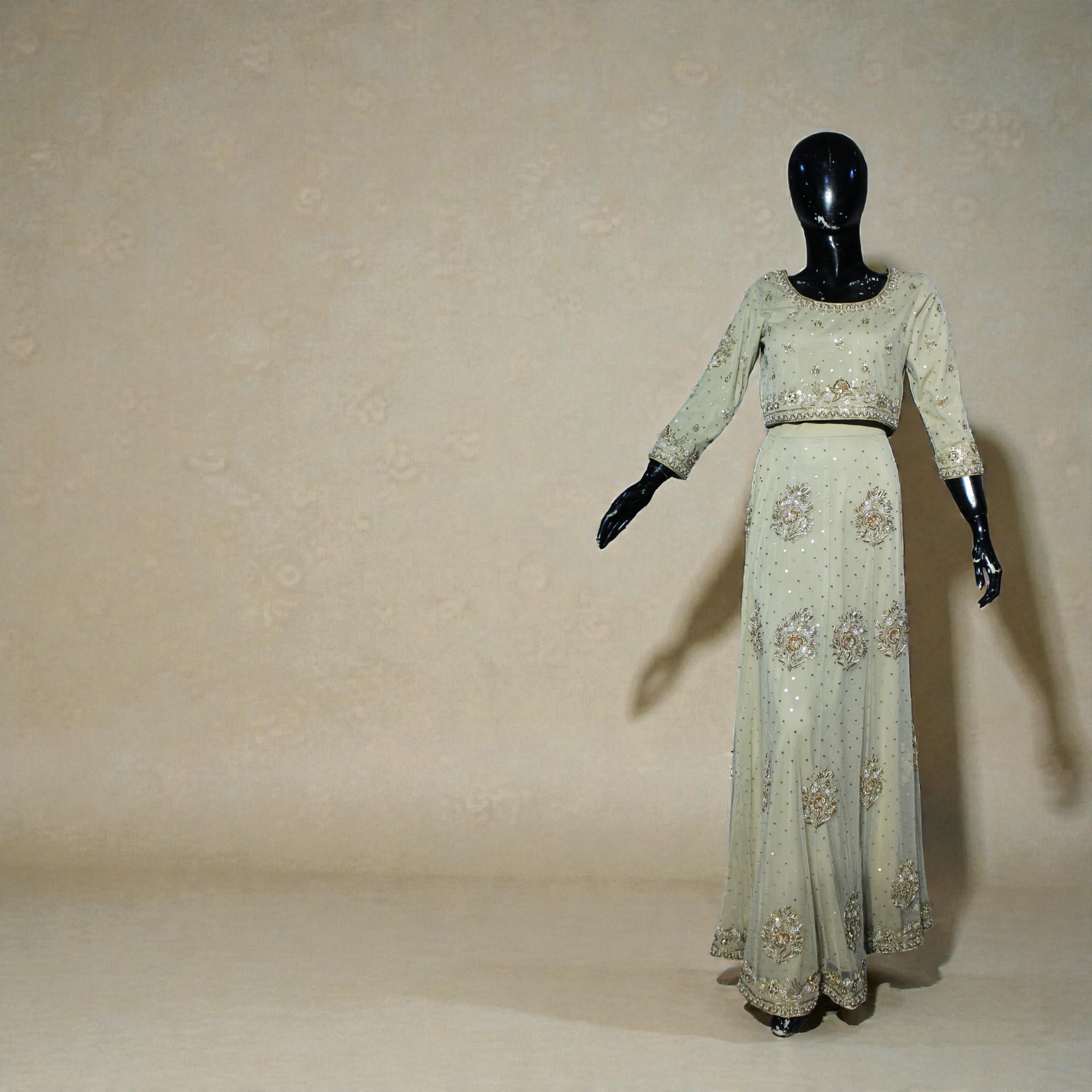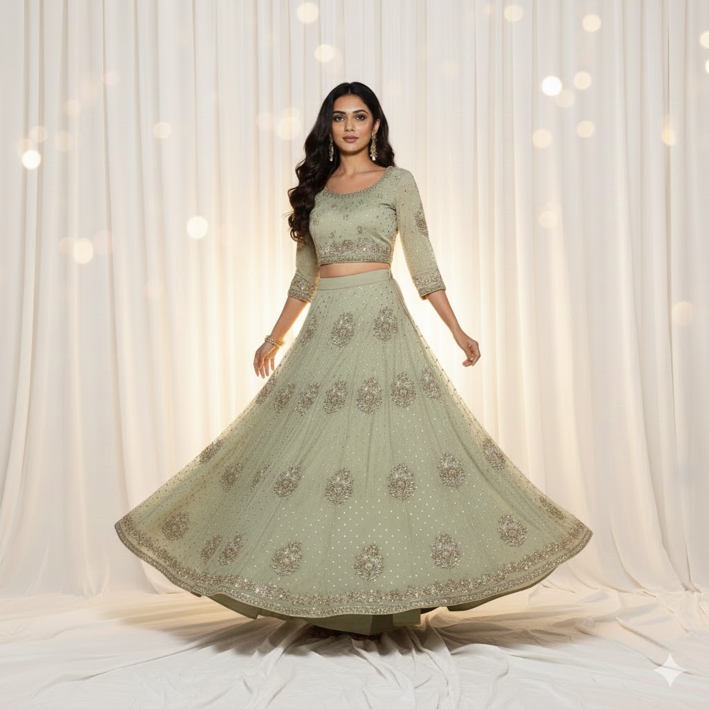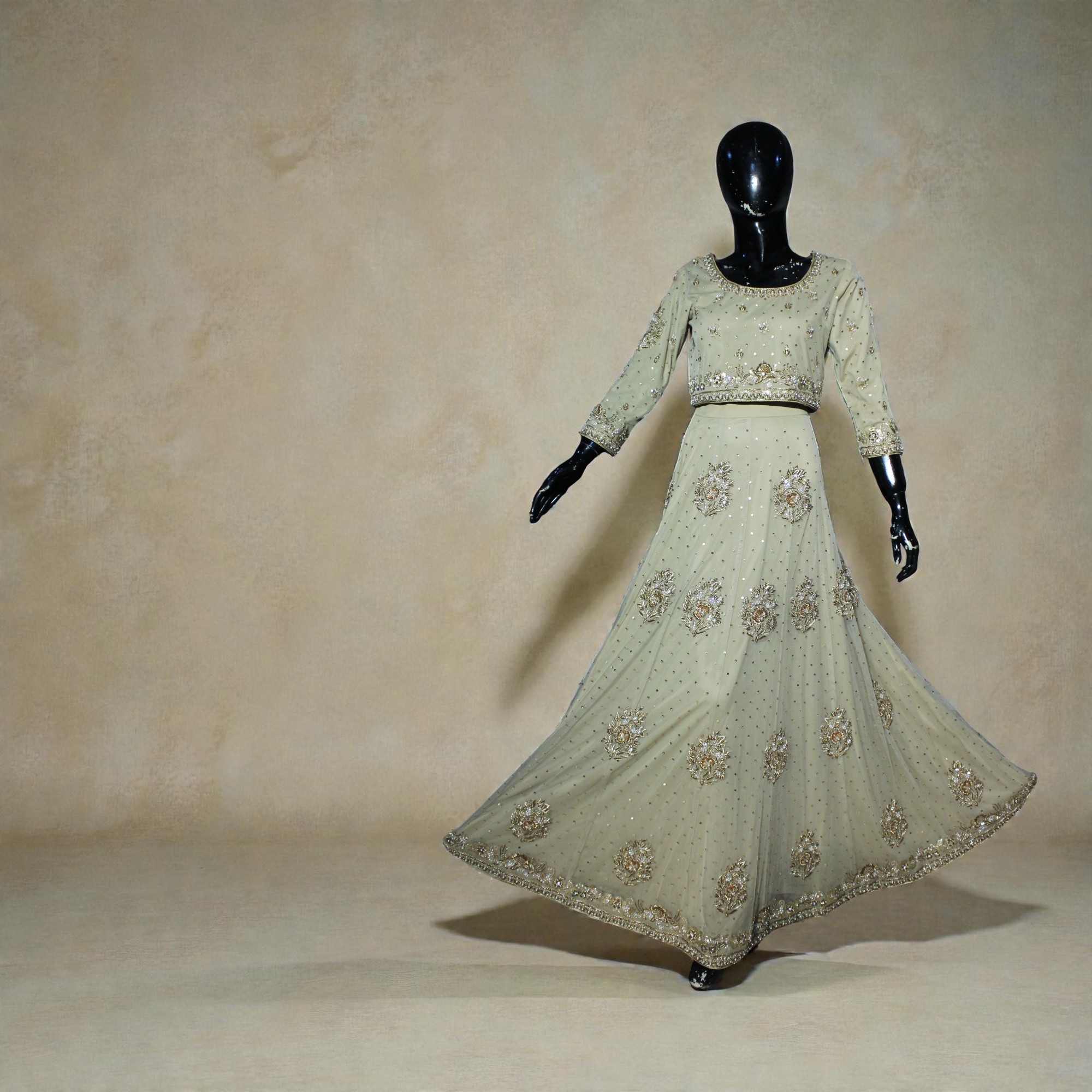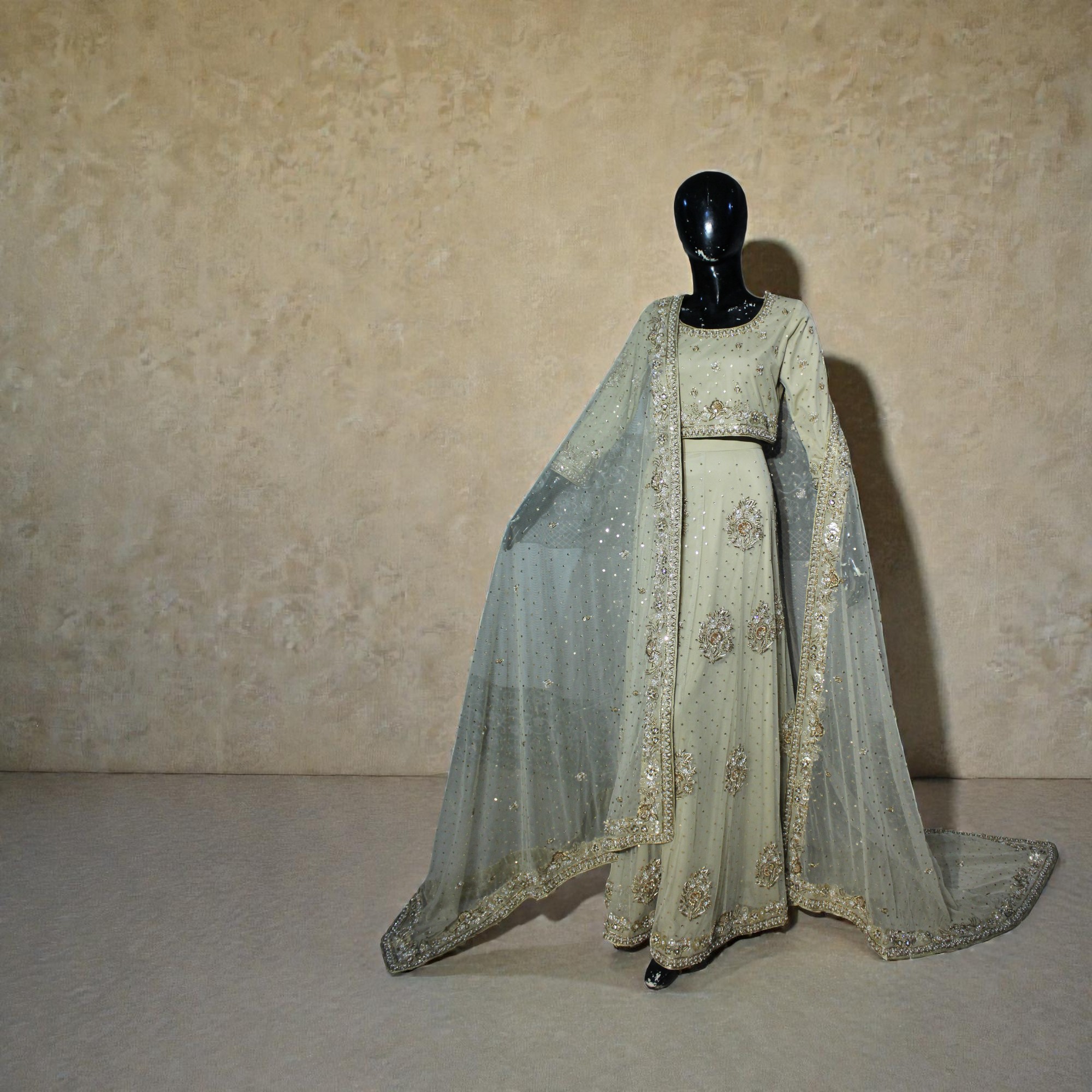 Embodying a refreshing and ethereal charm Gul Zamir is a testament to understated luxury and fine artistry. Rendered on a soft, sage green net, the silhouette features a modern two piece lehenga choli design. The cropped choli is intricately embellished with shimmering sequins and delicate floral motifs, while the voluminous lehenga skirt showcases a rhythmic pattern of embroidered booti and larger floral medallions. This set is paired with a matching sheer net dupatta, creating a look that is both breezy and regal perfect for a spring wedding or a grand evening celebration.