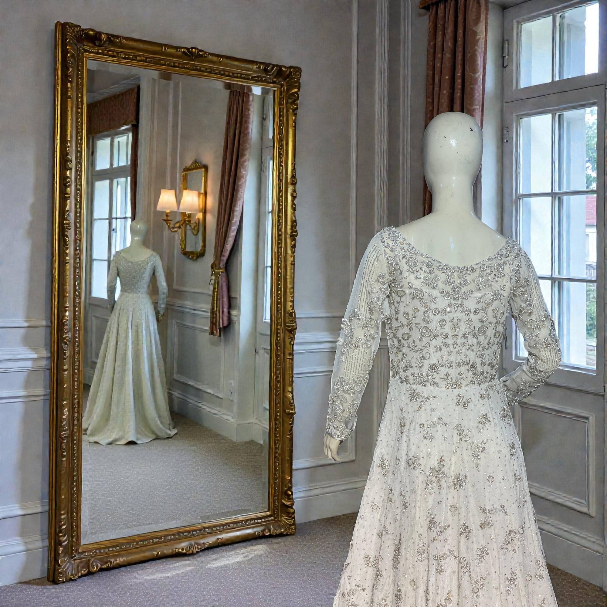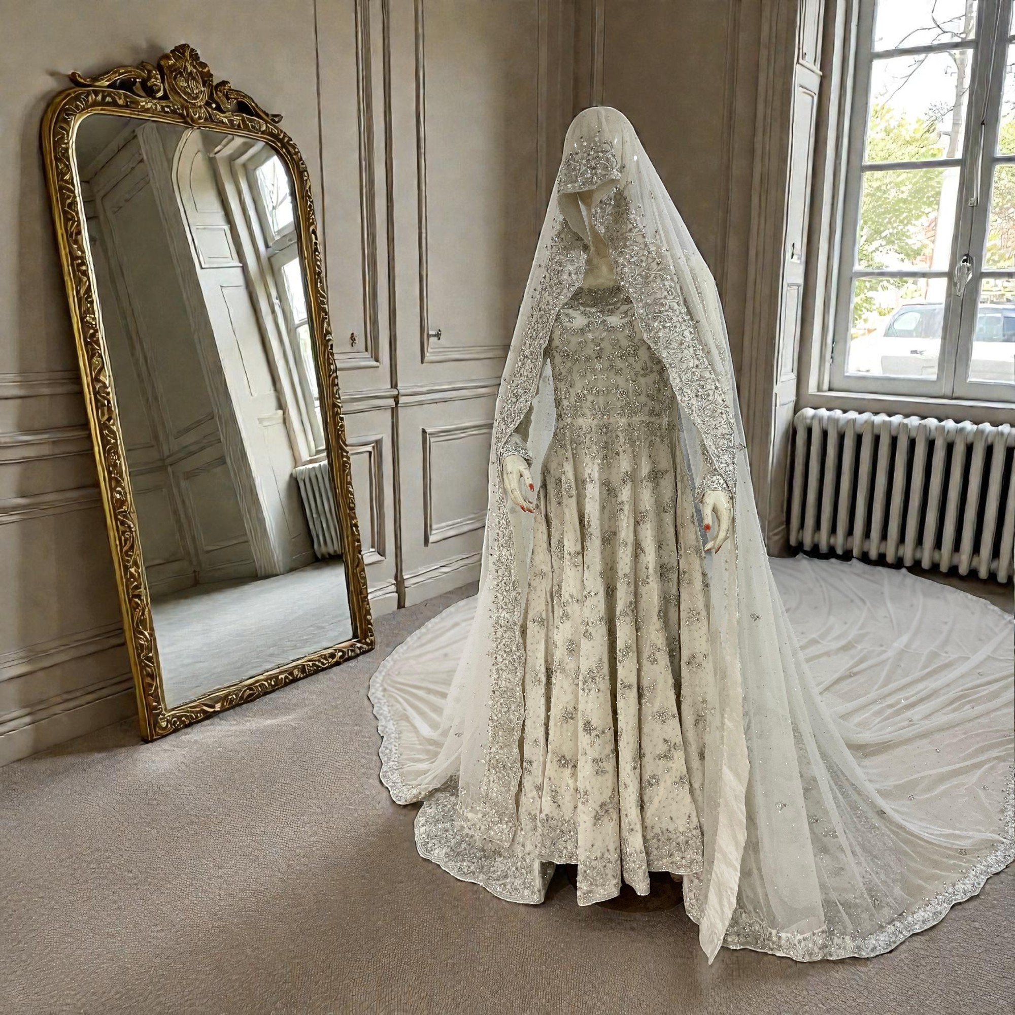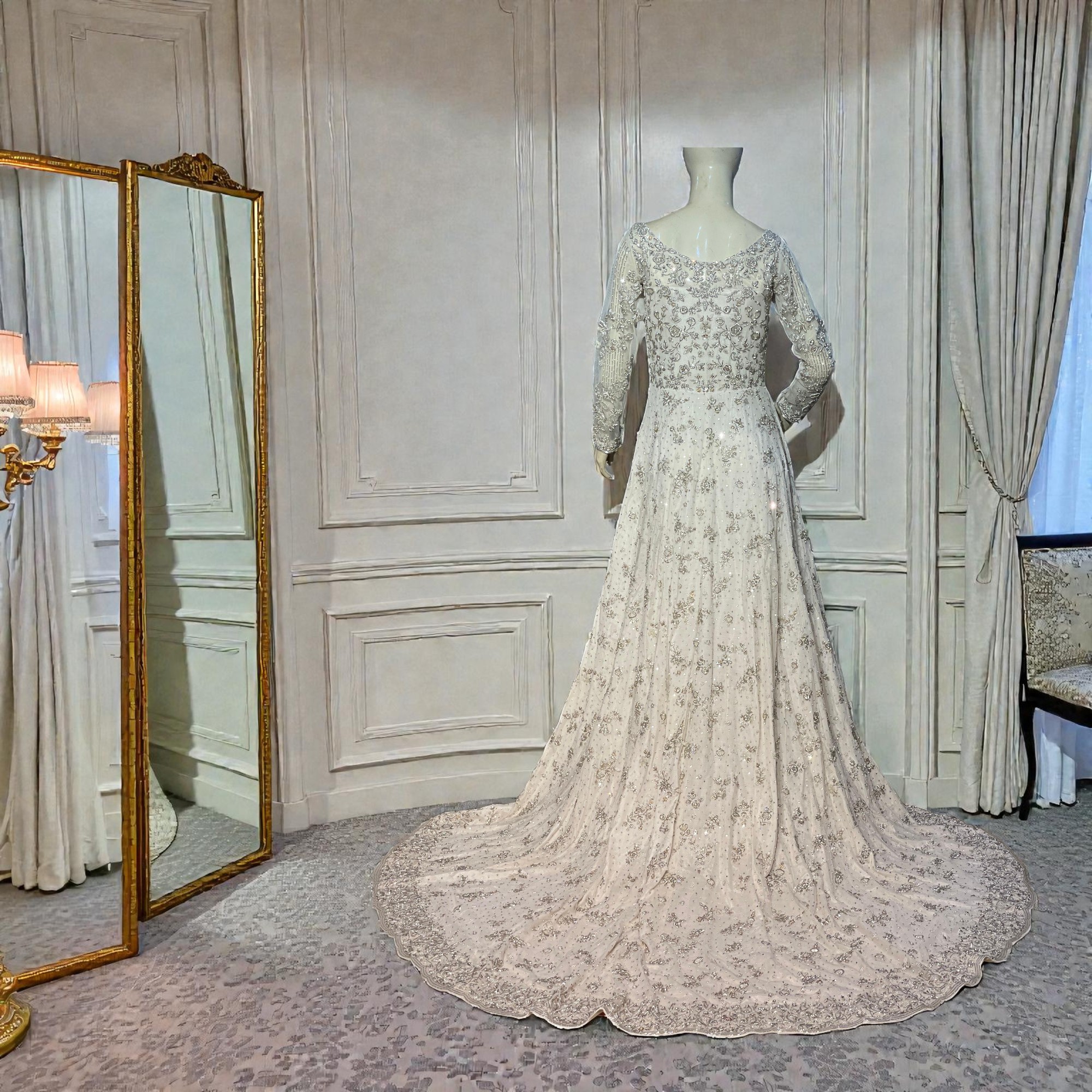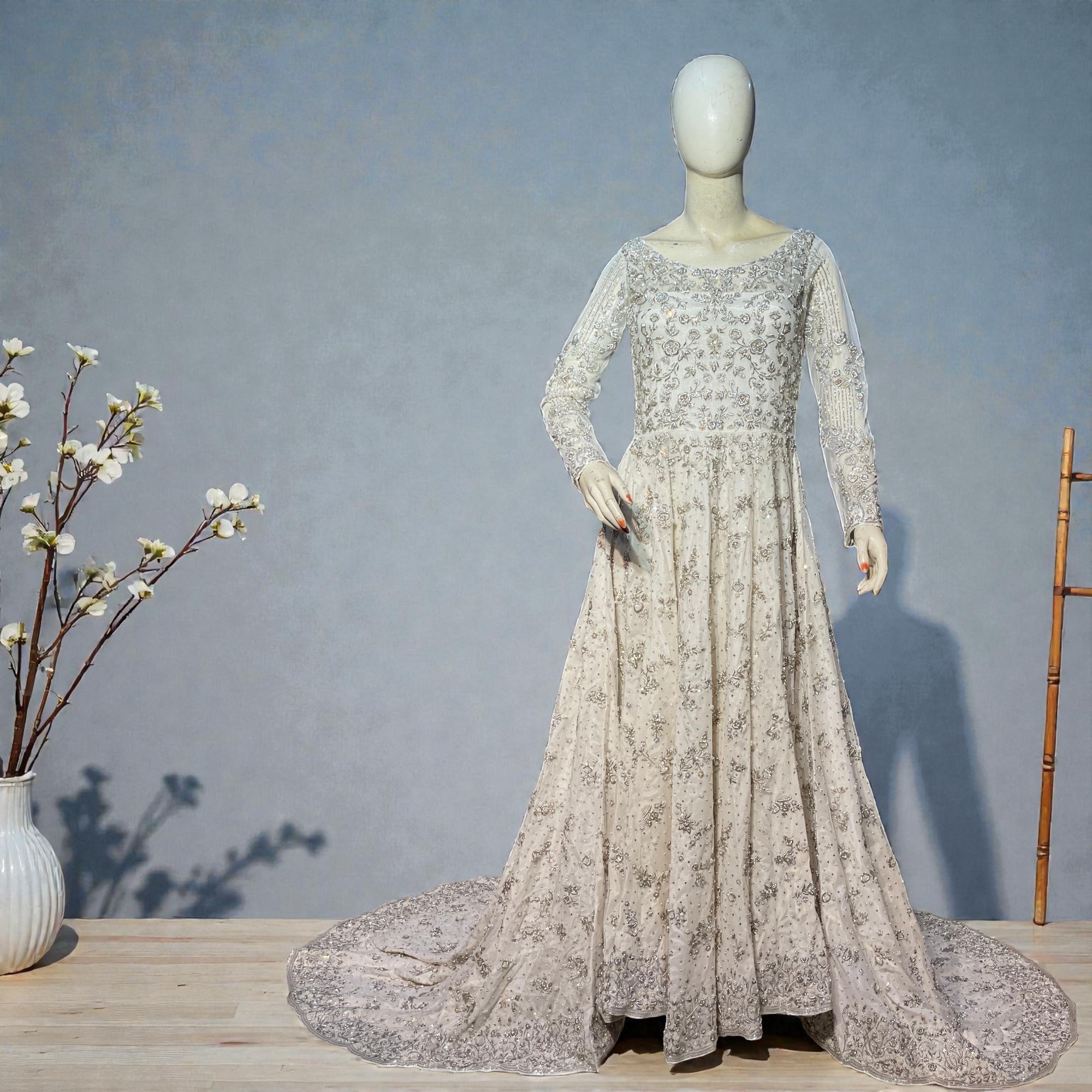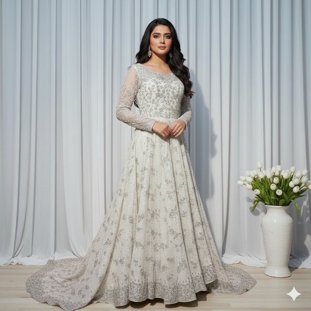 Channeling timeless grace, Noor is a poetic masterpiece of ethereal movement and ornate craftsmanship. Rendered on a soft ivory net, the floor-length Anarkali-style shirt is intricately adorned with celestial silver and gold tilla. Paired with a heavily embellished net sharara and a sheer dupatta, this ensemble evokes a sense of regal tranquility. The interplay of luminous textures and a grand silhouette creates an aura of classic sophistication, ensuring you capture the light at every celebratory occasion.