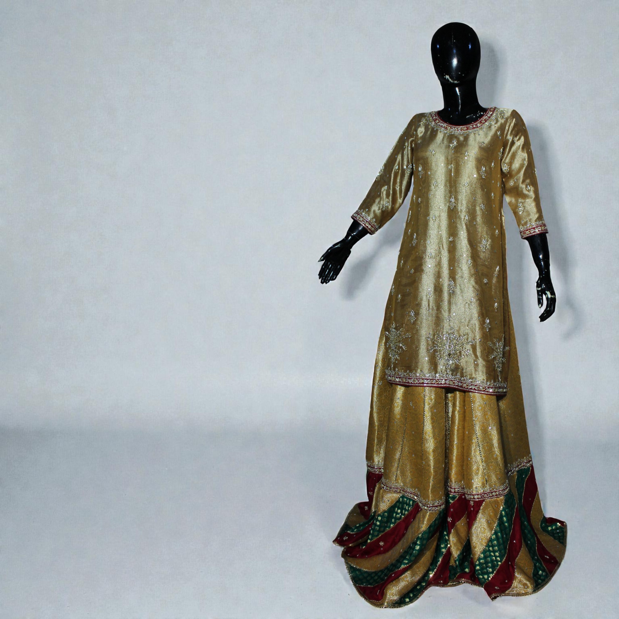 Chattapatti Gharara Panels (Multicolor Silk): Pre-stitched diagonal panels in gold, maroon, and green.