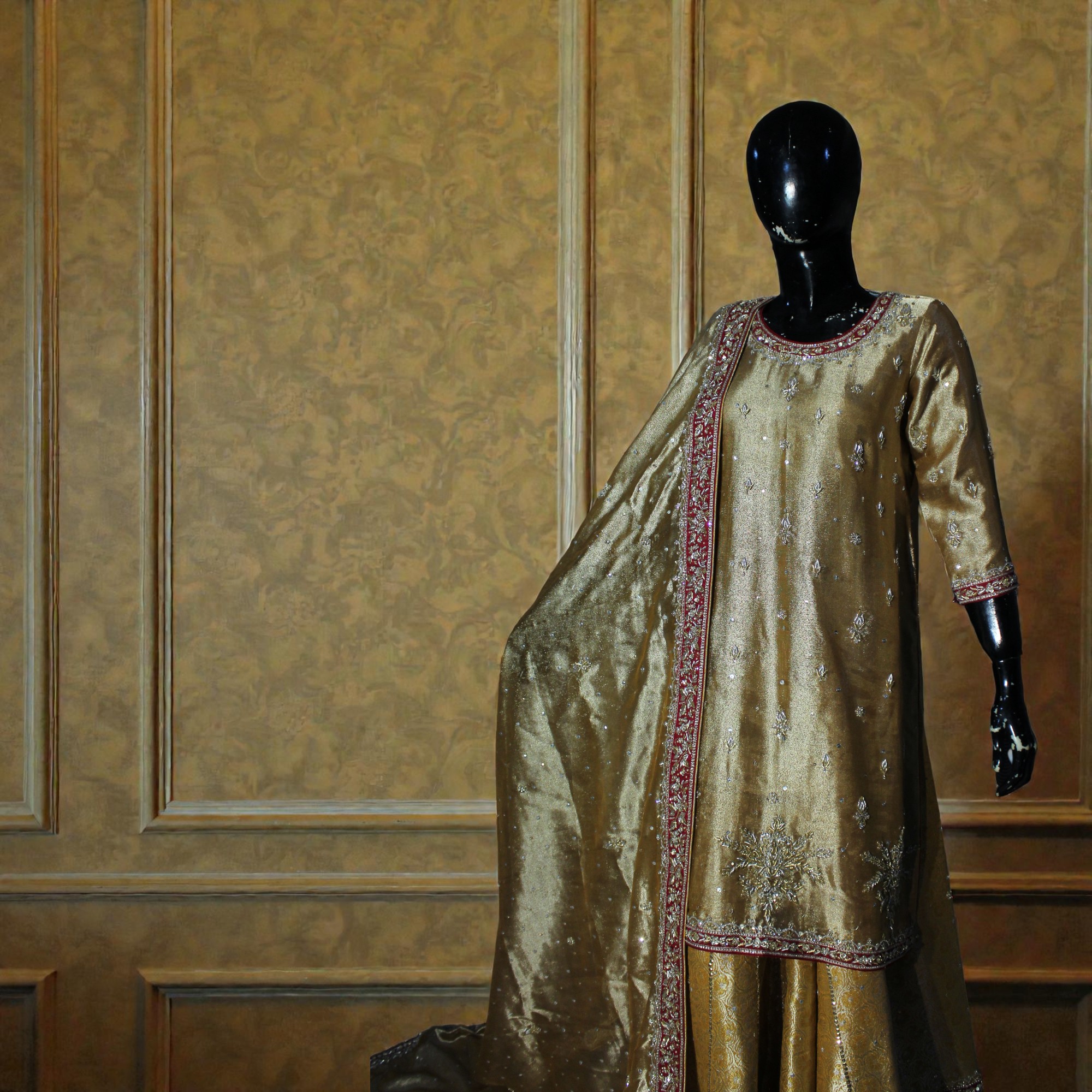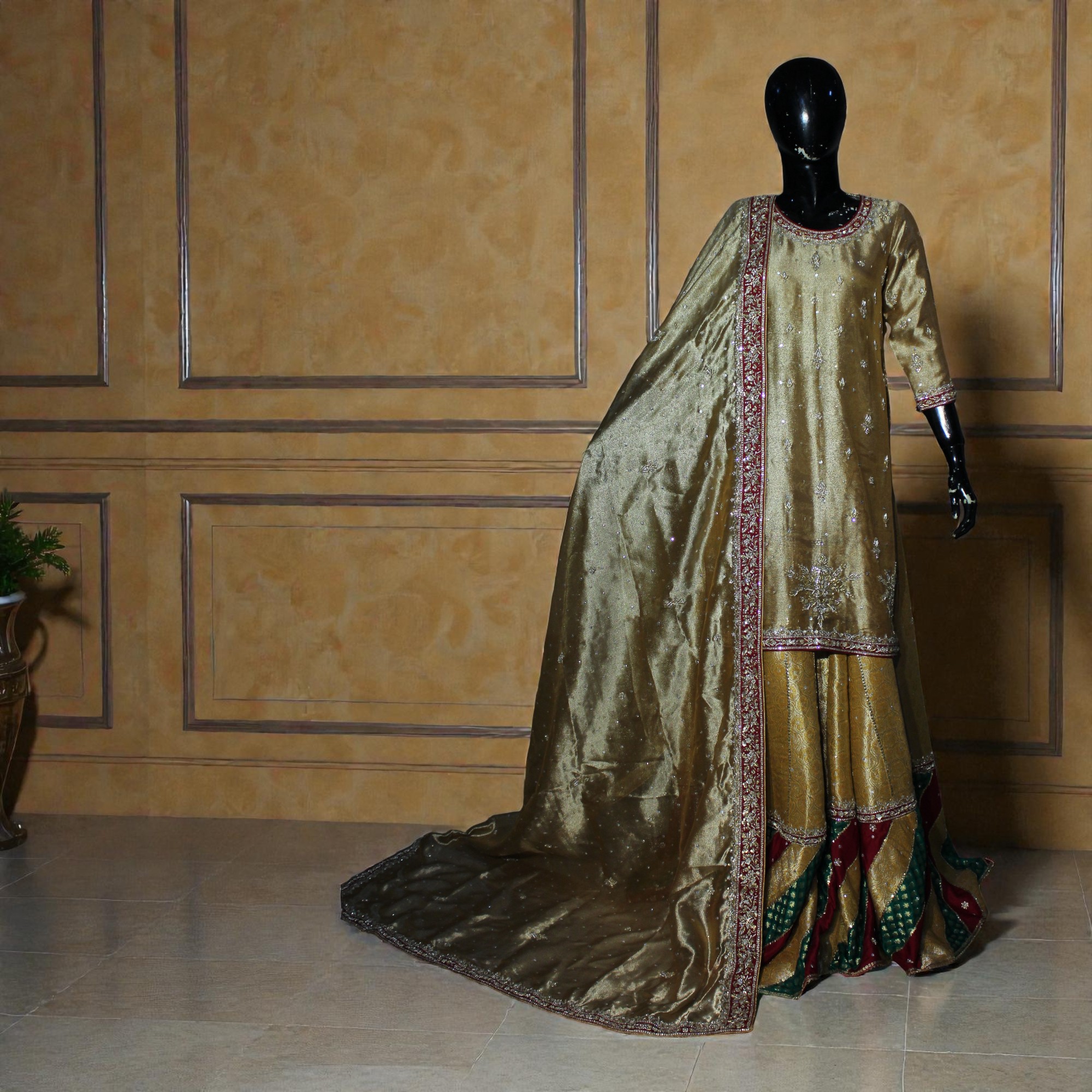 Infusing classic heritage with a vibrant, festive spirit Zarkash is a celebratory masterpiece of color and craft. This golden-olive ensemble features a long-form shirt meticulously rendered on a lustrous metallic silk base, adorned with delicate silver embroidery and starburst motifs. The standout feature is the traditional “Chattapatti” style gharara, showcasing a rhythmic interplay of deep maroon, forest green, and gold diagonal panels embellished with intricate gota and tilla work. Completed with a sweeping tissue-silk dupatta framed by a heavy bridal border, this look captures the timeless essence of regal wedding tradition.